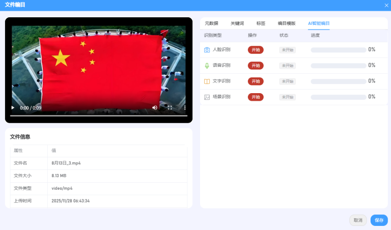 智能分析可将视频素材进行图像提取分析,根据后台数据及模型进行自动视频关键词标注索引;